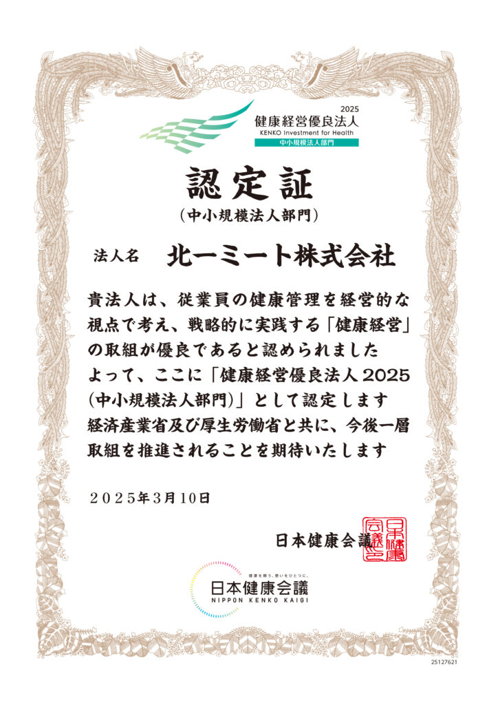 2025年3月10日、経済産業省・日本健康会議が選定する健康経営優良法人認定制度において、「健康経営優良法人2025(中小規模法人部門)」に認定されました。